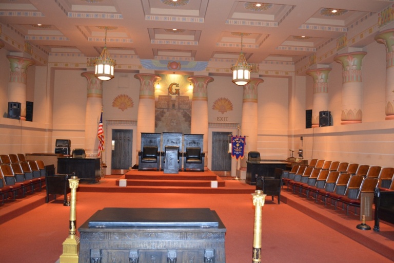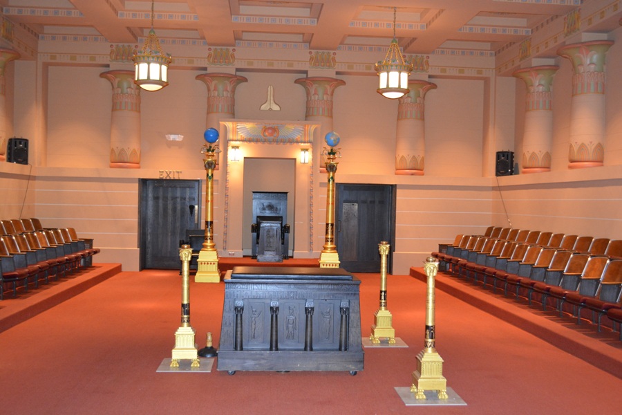 The Egyptian Lodge Room Entered through the Tiler's room flanked on the north by a preparation room and on the south by examination rooms, the Egyptian Lodge Room, an outstanding feature of the Temple, occupies the north side of the second floor. This room which seats 112 is not only an exact replica of the nationally famous lodge room in the Temple at 9 North Nevada Avenue but is actually constructed of the columns, ornaments, and other features removed from the original room. The altar, officers' chairs, and podiums as well as the seating are all the original furnishing from the Temple at 9 North Nevada Avenue.