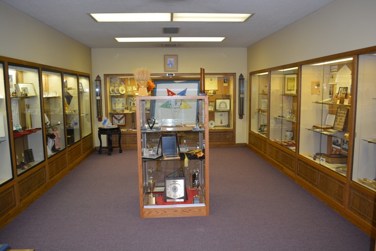 Situated near the geographical center of the State in a unique setting with majestic Pikes Peak in the background, the building is aesthetically compatible with the adjacent Masonic Temple. Entrance is from Panorama Drive on the east into a beautifully furnished reception room with the museum on the south and the library on the north. Offices occupy the west end of the building which terminates in an apartment for the use of the Grand Master on his numerous visits to the headquarters of the Grand Lodge.